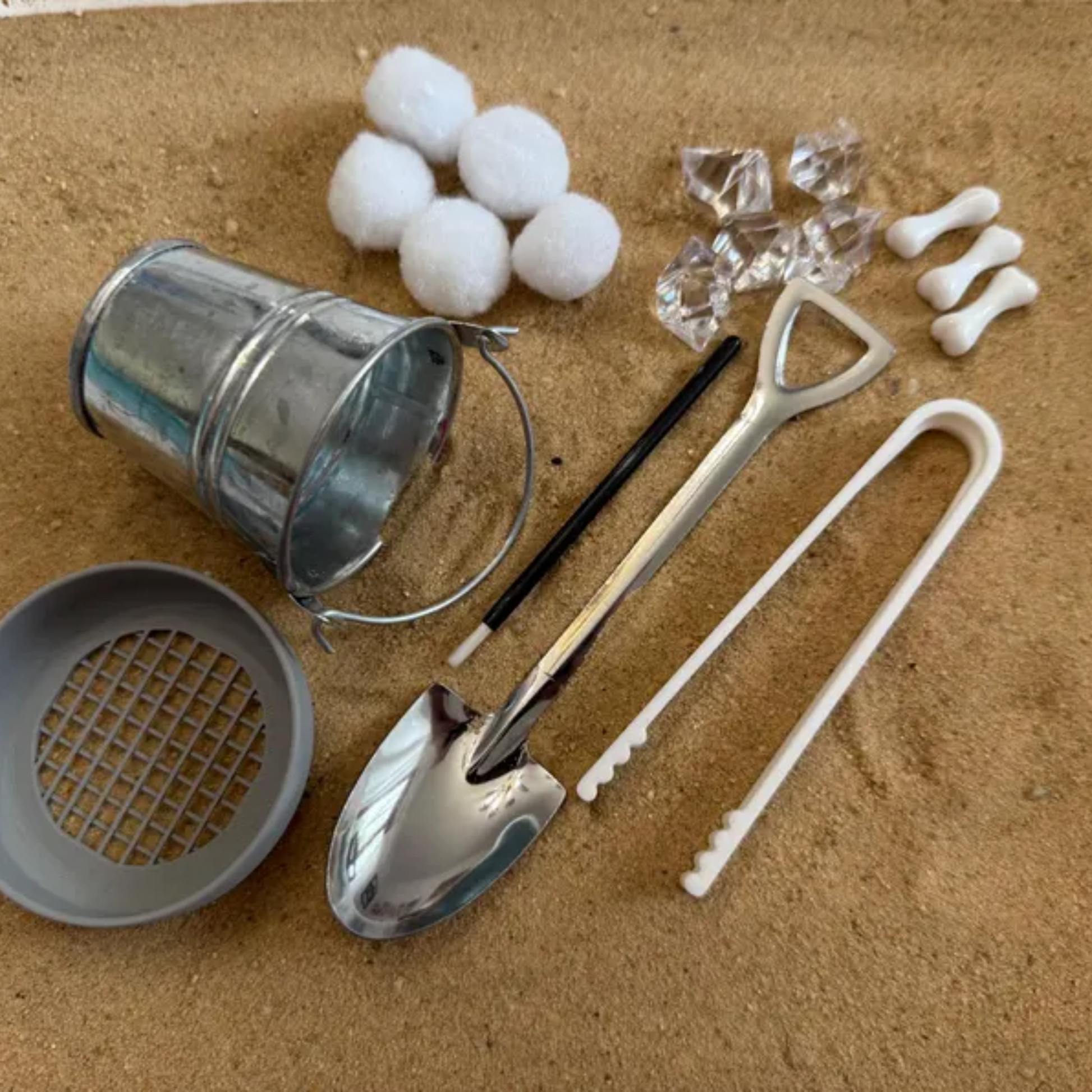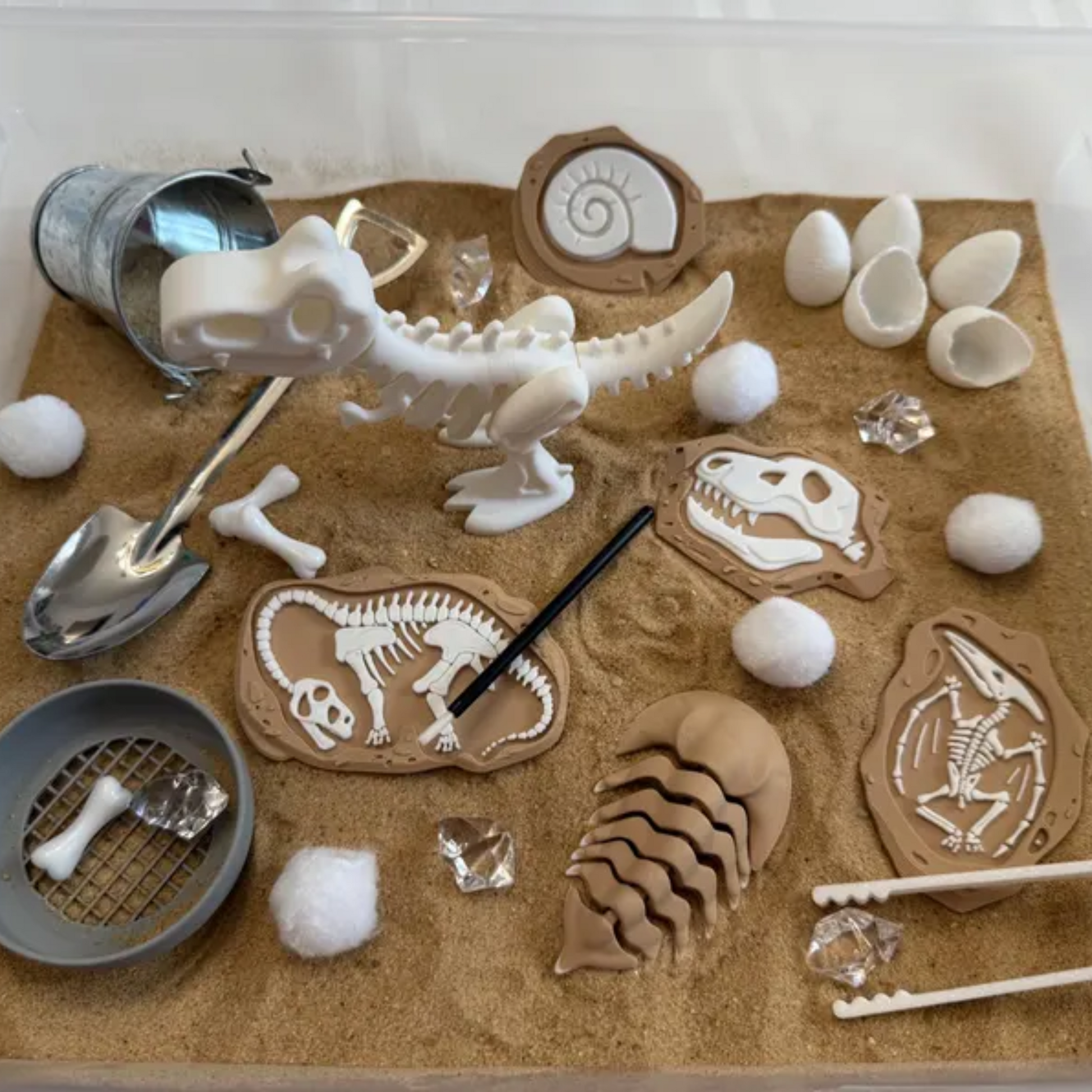 This sensory bin includes everything your child needs to become a paleontologist for the day—realistic dinosaur fossils, digging tools, sensory base materials, and themed props for imaginative play. Whether they're brushing off fossils or role-playing a dinosaur dig site, this activity offers hours of screen-free, educational fun.